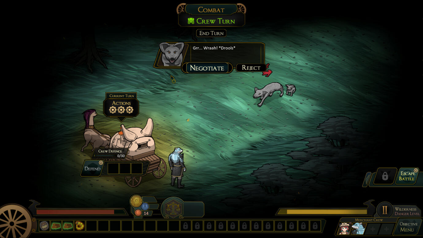 Bandits and wild beasts are constantly eyeing your wagons. Enjoy turn-based combat with a merchant twist: each of your trading goods can be used in combat with its unique effects.Grab a crate, and throw it their way! Be sure to pick them back up though... they’re still valuable.Alternatively, for a peaceful resolution, negotiate your way out of a fight!
